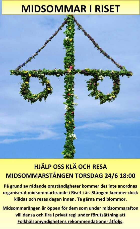 Tyvärr så blir det inget anordnat midsommarfirande på midsommarängen i år heller. Vi får hoppas att allt är tillbaka i vanlig ordning nästa år och att vi kan fira midsommar tillsammans då.