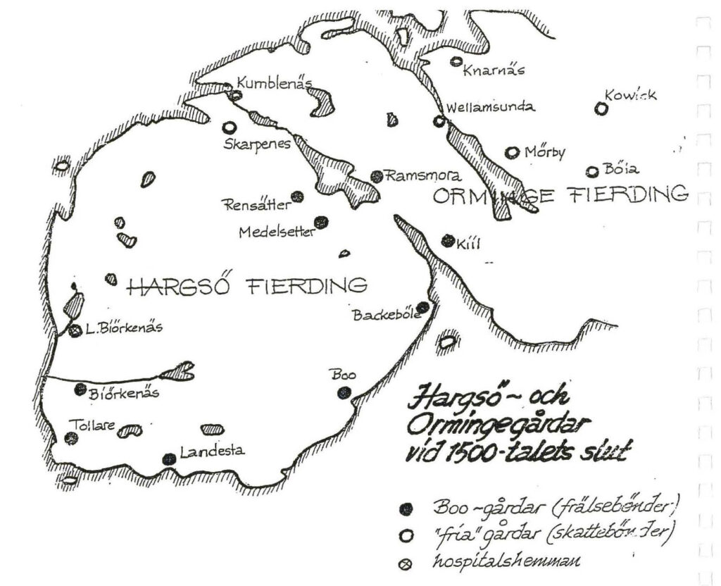 Göstaf Eriksson (Gustav Vasa) drar in allt till Staten under sin regeringstid och när han bygger två försvarstorn av gråbrödernas kloster på Kindskär (Riddarholmen) förvisas dessa till Danviken. Kvar i Boo blev bara Tisdagsholmen, Spitalieön, då det troligtvis var en ö för de spetälska, samt lilla Björknäs, Hospitalets. Gustav II Adolf som ärvde ett krig men inga pengar börjar med förläningssystem för att avlöna sina krigsherrar och höga tjänstemän. Därför kom Orminge fjärding till stor del att ägas av Gustav Gabriel Oxenstierna med säterierna Mörby, Knarrnäs och Bölan. Han ägde även Farsta där han startar tegelbruk och år 1637 börjar bygga ett slott av produkten. Gustav var bror med Axel och kallade sin boning för Gustavsberg. Nu heter det Farsta slott och bondlandet heter Gustavsberg. Det är dom historielösa som kastat om begreppen. Gustav II Adolf försåg fler av sina närmaste medarbetare med förläningar och år 1624 gavs ett säteri inklämt mellan Gustav Gabriels egendomar, med dåligt jordbruk, till Tullnären (Rikets export och importcheD Lars Bengdtson. Det var Velamsund. Kummelnäs var 1608 skänkt till Sven Månsson Eketrä som ingick i Kung Karl IX närmaste administration och Boo ägdes sedan tidigare av Gustav Adolfs livmedikus Olov Bure, gift med Elisabet Bagge som ärvt gården. Historisk säger man att det var år 1635 som Boo föddes i och med att Boo kapell invigdes och blev en kapellförsamling. Det var tillgången till gudstjänstlokal som gav behörigheten till en trakt. Doktor Olov Bure på Boo Gård byggde kapellet och skänkte ödegården, Ramsmora, som prästgård. Sedan dess har kapellet och prästgården legat där de ligger än idag. Ramsmora är gammalt och ordet har betydelsen Korpskogen. Torpet Ramsmora var ett arrendetorp som brukades in på 1900-talet och några äldre Risetbor kommer faktiskt ihåg arrendator Larsson och sedan Hertzberg som plogade snö på Riset. En tidig arrendator, !sidor Carlsson, var med och byggde Gränsvägen som idag heter Kummelnäsvägen. Det var Carl Isidor som hade affären på Tegelön. Då, när det begav sig ägdes Boo av tre personer, Olov Bure på Boo, Sven Månsson Eketrä på Kummelnäs och Gustav Adolfs trotjänare Lars Bengdtsson på Velamsund.